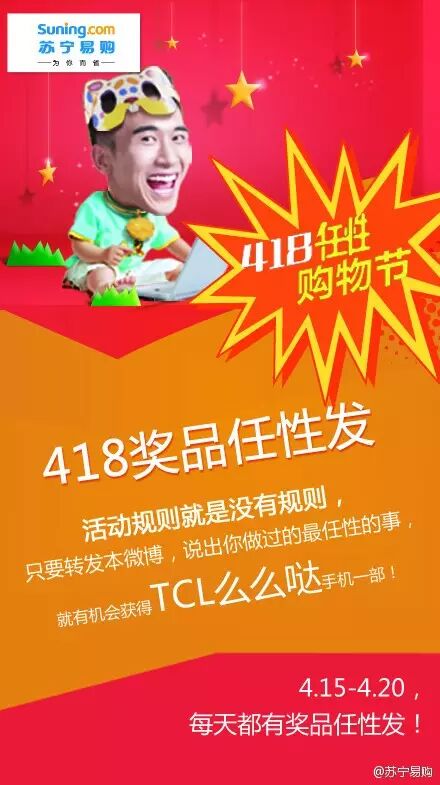 3、苏宁易购:从苏宁推出“418任性购物节”的宣传创意中,这比附营销的痕迹还是不言而喻的。